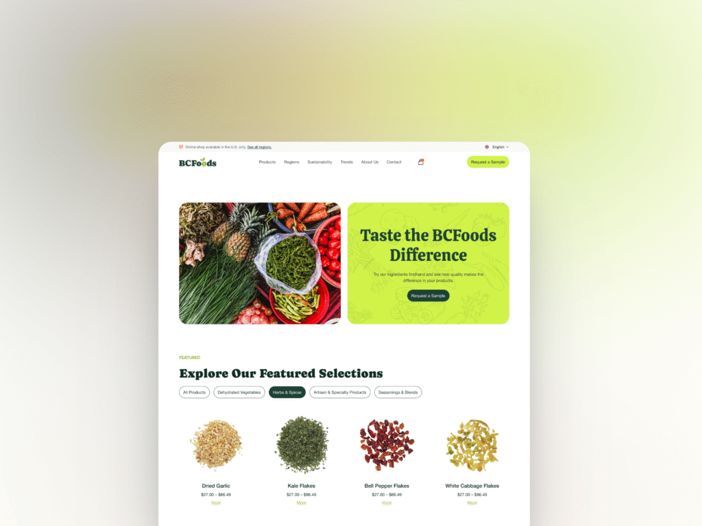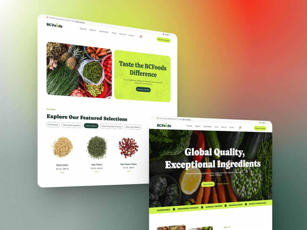 BCFoods is a global supplier of premium dehydrated vegetables, herbs, spices, and artisan ingredients. The website was designed to serve both as a robust eCommerce shop and a B2B product catalog, balancing user-friendly online purchasing with in-depth product exploration for manufacturers and culinary professionals.