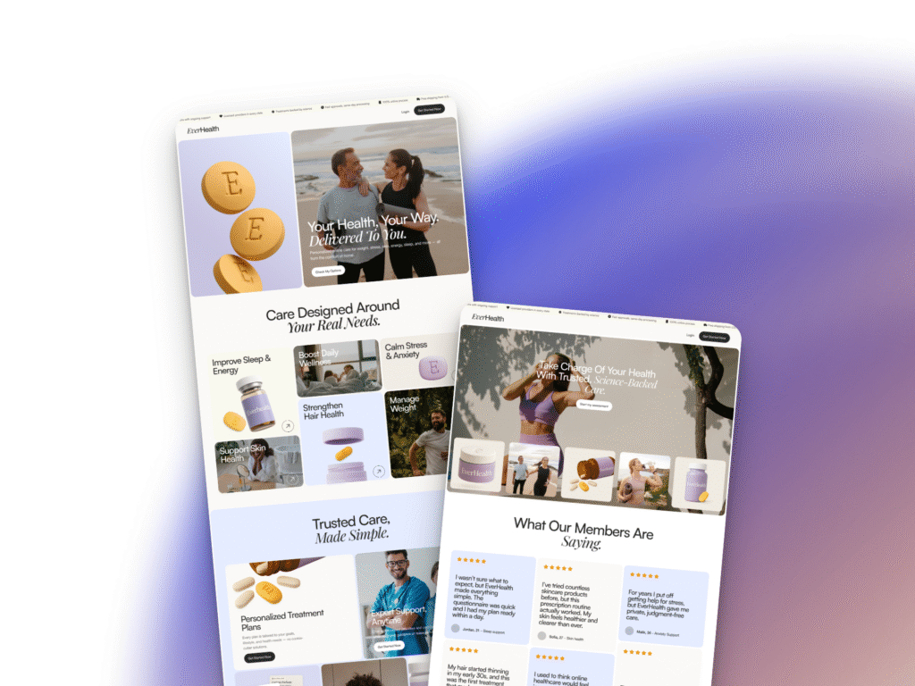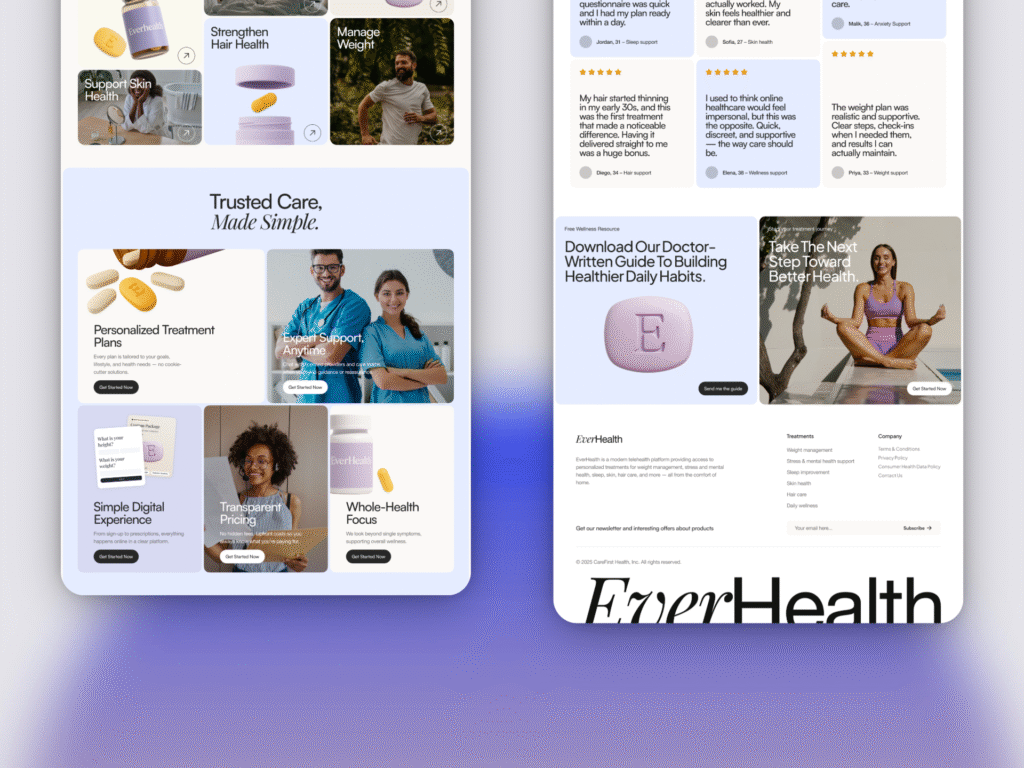 EverHealth is a modern telehealth platform that provides personalized treatments for weight management, stress and mental health, sleep, skin, hair care, and overall wellness — all delivered discreetly and conveniently online. The design focuses on clarity, trust, and accessibility to make healthcare approachable and human-centered.